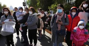 Các gia đình chờ xe bên ngoài một bệnh viện nhi ở Bắc Kinh, Trung [...]