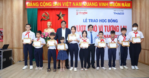 Ông Nguyễn Sơn Hùng, Phó chủ tịch UBND tỉnh Đồng Nai (bên phải) và nhà văn Nguyễn Một (đại diện Thaco Gruop) trao học bổng cho các em học sinh, mỗi suất trị giá 2 triệu đồng