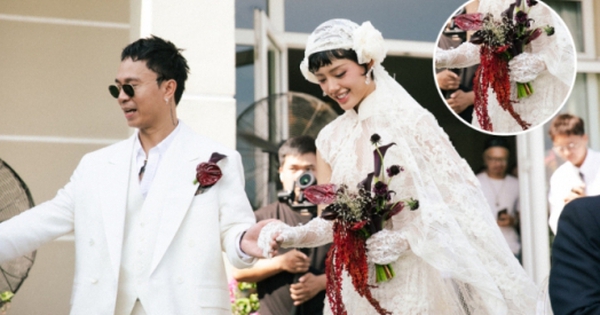 Không gian ăn hỏi có tone màu chính là đỏ, xanh và trắng nên mang lại cảm giác ấm áp. Đến bó hoa cầm tay cũng là sự phối kết hợp của các tone đỏ làm điểm nhấn. Khi cô dâu diện váy trắng thì sắc đỏ của bó hoa này càng nổi bật thu hút nhiều sự chú ý. Theo như bật mí, thì đây là bó hoa kết hợp giữa 4 loài: Scabiosa (hoa tai thỏ), Cala lily, Hồng môn và dền rủ – sự phối kết hợp độc lạ như cá tính của Cô Em Trendy vậy!