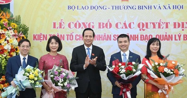Bộ trưởng Đào Ngọc Dung, các Thứ trưởng Bộ LĐ-TB-XH, Thứ trưởng Bộ Thông tin và Truyền thông Nguyễn Thanh Lâm, Vụ trưởng Vụ Báo chí – Xuất bản (Ban Tuyên giáo Trung ương) Tống Văn Thanh, tặng hoa chúc mừng lãnh đạo báo Dân trí sau kiện toàn, tổ chức lại