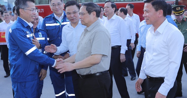 Tại đây, Thủ tướng Phạm Minh Chính đã đến thăm, tặng quà, động viên cán bộ, chuyên gia, kỹ sư và công nhân, người lao động đang làm việc tại Nhà máy Lọc hóa dầu Nghi Sơn – công trình trọng điểm quốc gia.